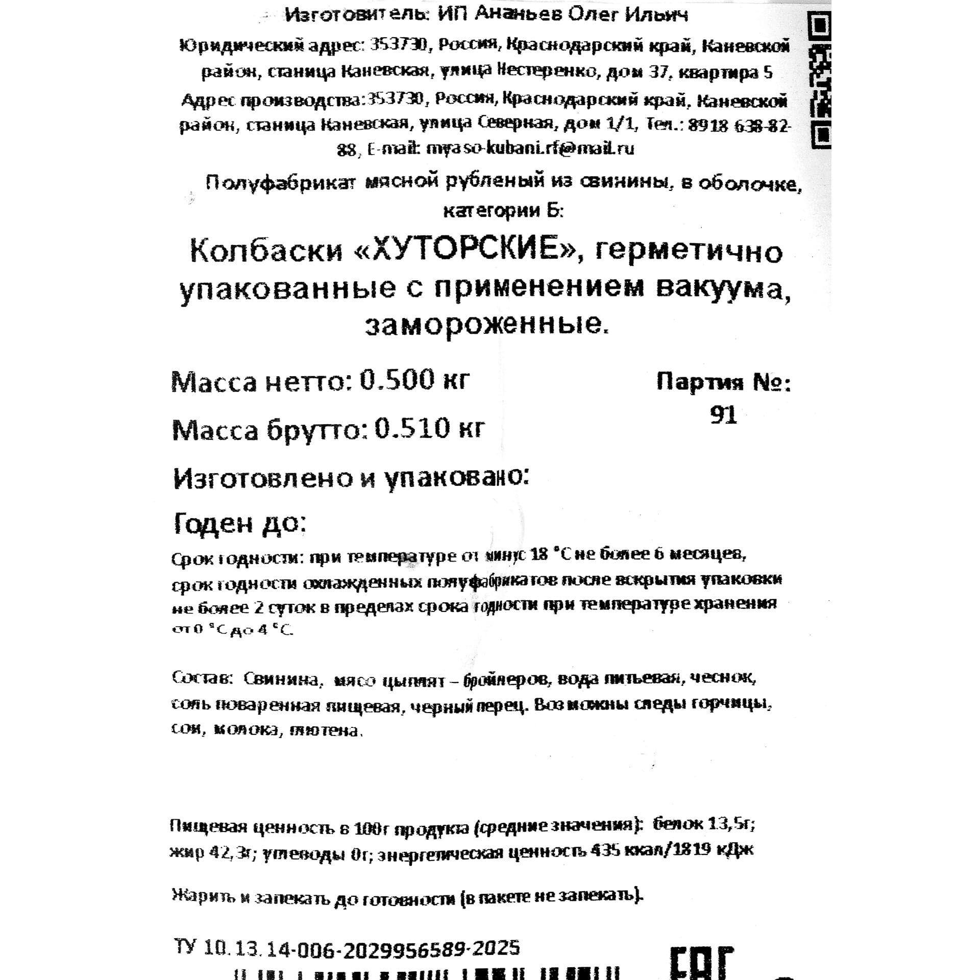 Колбаски из свинины и курицы "Хуторские" полуфабрикат замороженный Мясо ничего больше 500 г